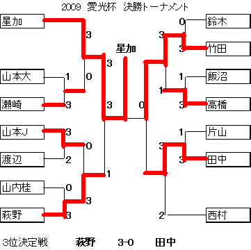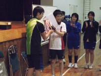 2009年12月5日(土)の午後、体育館で今年度の愛光杯卓球大会を行った。参加したのは現役部員23名とOB3名のあわせて26名。例年通り、予選リーグを実施して、各リーグ上位2名ずつによる決勝トーナメントを行った。その結果、OBの星加伸大君(35期)が初優勝した。