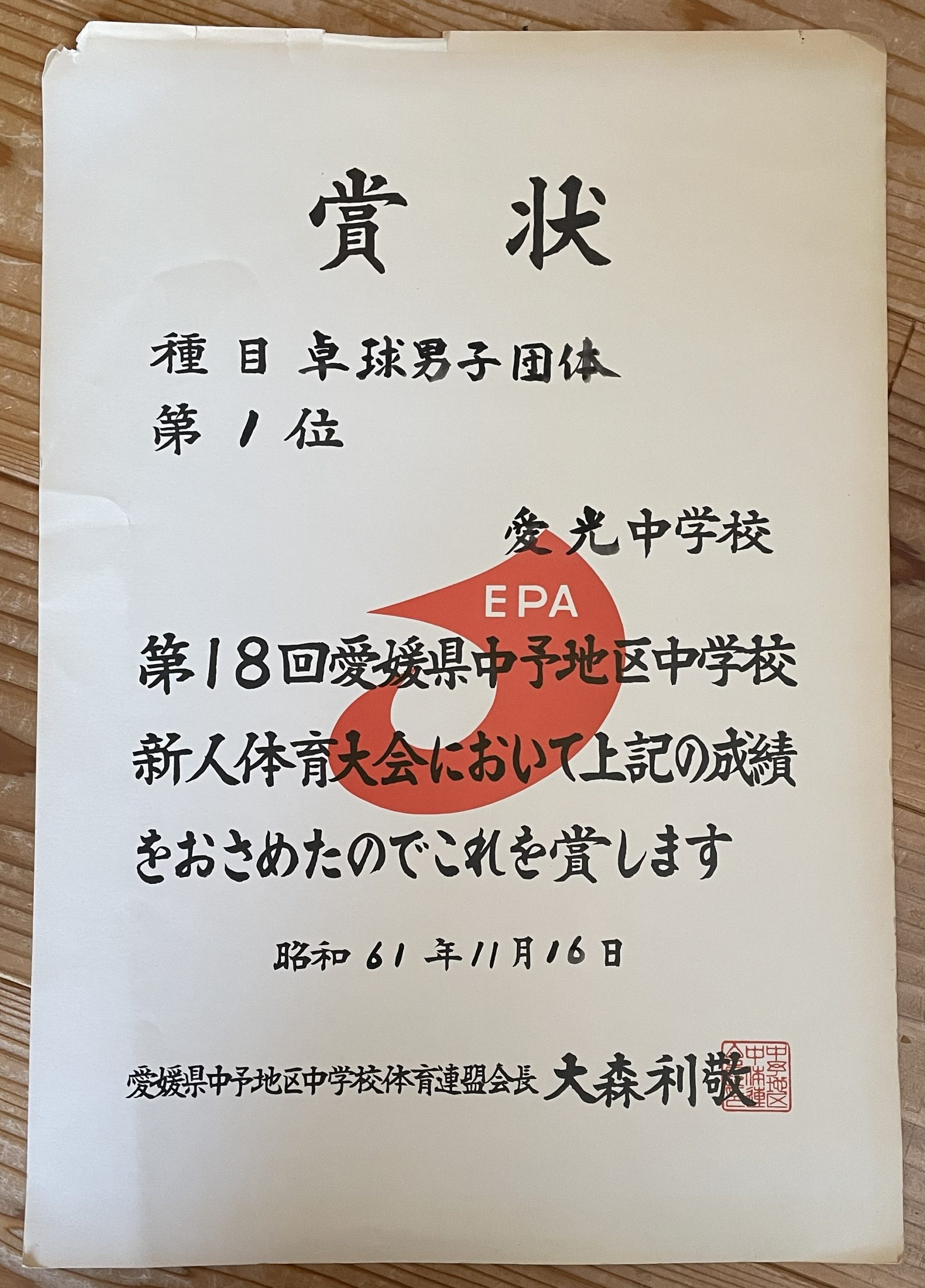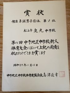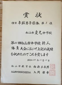 翌年、昭和61年(1986年)秋の中学新人中予大会の賞状。なぜか、市大会の賞状がありません。(市大会は附属中に負けて2位でした)
