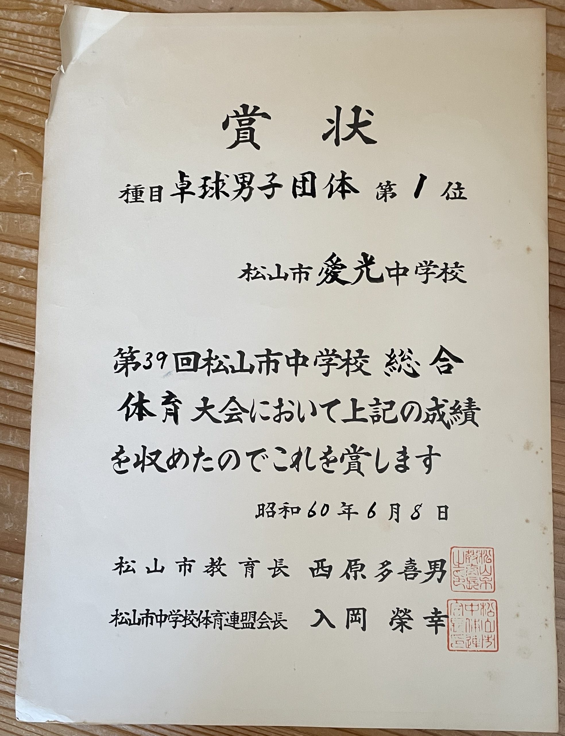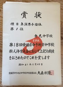 ↑昭和59年(1984年)秋の中学新人市大会の賞状。31期と32期で参加した大会だと思います。
