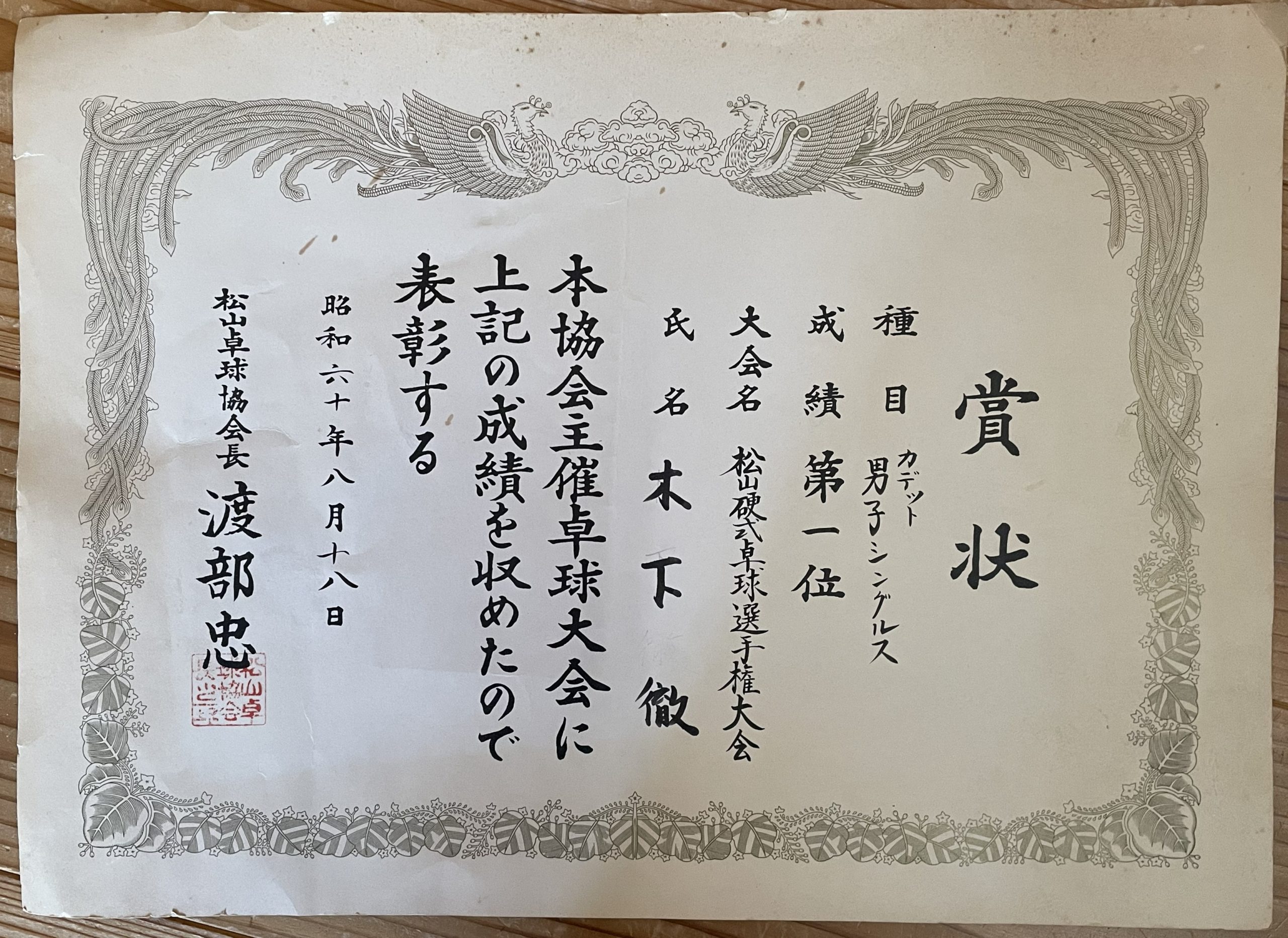 これは昭和60年(1985年)夏のカデット大会、木下君の個人戦の賞状。