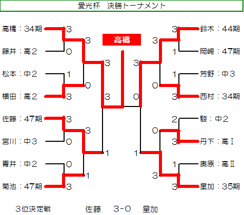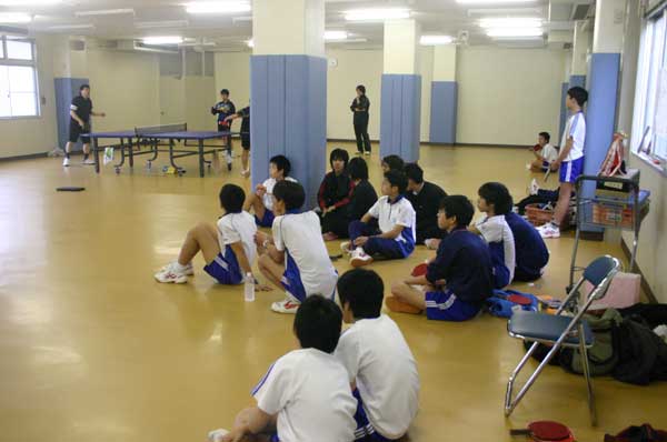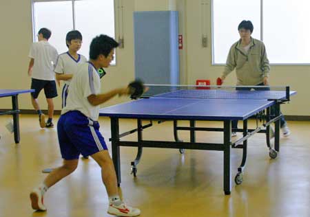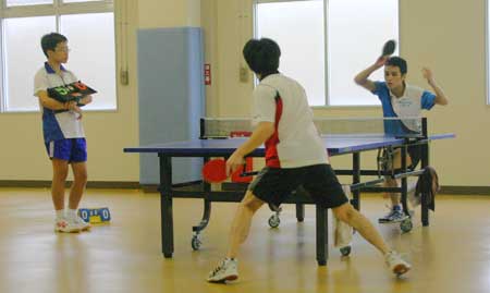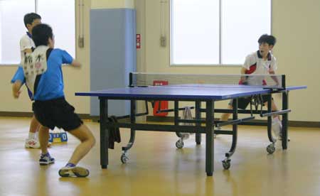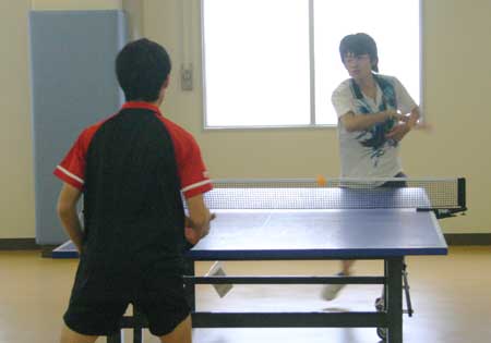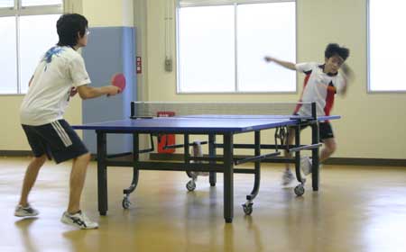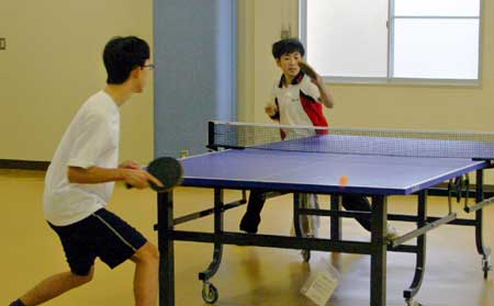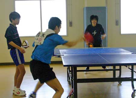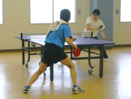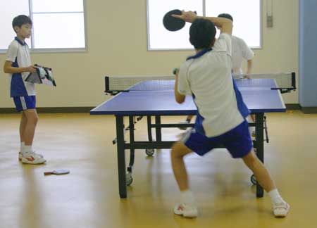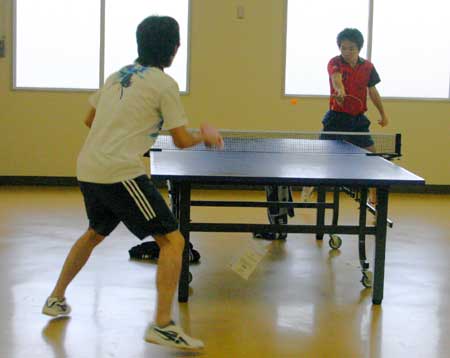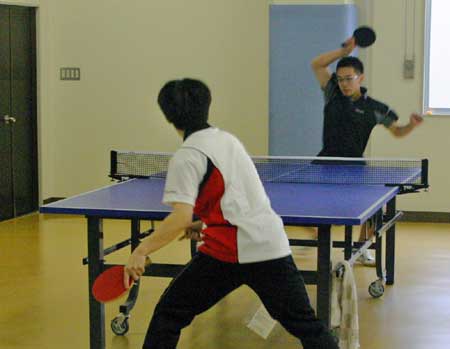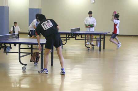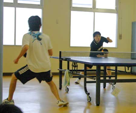 予選リーグ風景  予選リーグ8班。高2の藤井が遅刻して参加し、この班に入ったため、ここは激戦になった。この試合は藤井(左)対浪本。  これも同じく8班の試合。手前が高2の横田、向こうが47期の藤川。大学ではアメラグをやっているらしい。  右はOB星加。左は中1の堀淵。  同じく、星加対丹下(高1)。  向こうは47期の菊池、手前は中3の山本?。  会場は、体育館からトマス寮特別棟2階の卓球場に変わった。  左はOB西村、右は顧問の水口先生。  左のOB鈴木は大学の医学部、本学の両方の卓球部で練習中。強くなっていた。  OB高橋は予選リーグから、打ちまくっていた。  手前はOB野村、向こうがOB高橋で、34期高知県出身同志の試合となった。 |