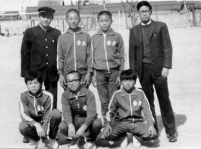 これも17期生の写真。右端に写っているのは、当時顧問だった小立先生。グランドがずいぶんと狭そうだが、宮西校舎の時代のものである。(現在のフジグランのあたり) | ||||||||