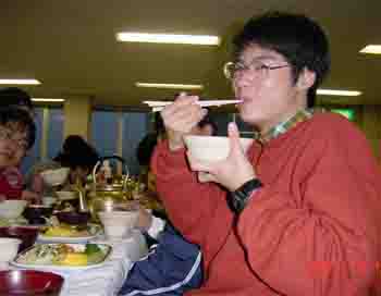 | →これはその日の夕食。食っているところの写真ばかりになってしまったが,合宿の最大の楽しみはこれだからしょうがない,といえよう。 |