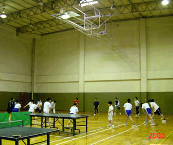 左側に見える遮光カーテンは西日防止用。そこをあけると、海が見える。しかし、日差しは卓球の敵である。
