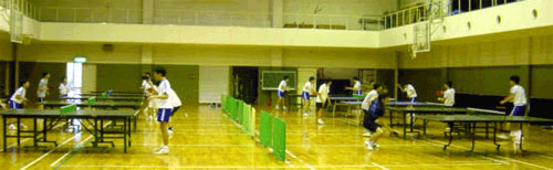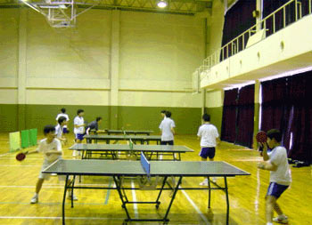 部員18名に顧問1名、OB2名が練習。卓球台は10台並べた。ネットは学校から持参した。