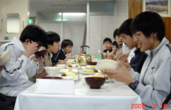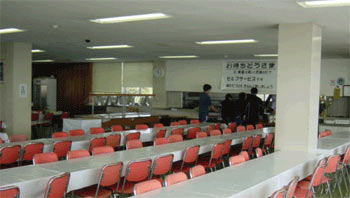 食堂はセルフサービスなので、自分たちで配膳しなければならない。A〜Dの4つの班が交代でその仕事をこなした。当番以外の部員は少しゆっくり目に食堂にやってくる。 |