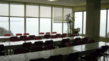 センターの食堂は3階にあり、窓が南の海に向かって開けている。瀬戸内海がみえるのだが、卓球部の席は食堂の北の奥で、京都産業大学ラグビー部員の山にさえぎられ、よく見えなかった。 |