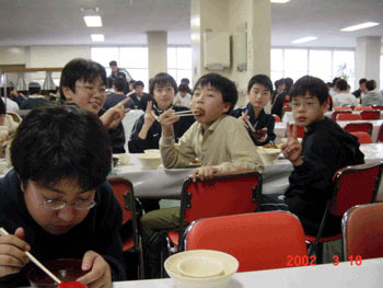 食べる中1軍団。瞬時にピースをするもの、3名。箸をもったままでも、ピースは可能である。 |
