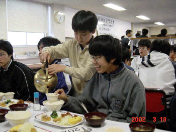 配膳完了の「いただきます」の直前の時期。当番の部員がお茶をついでまわっている。こんなこと、自分の家でもやるんだろうか。 |