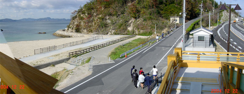 ↓歩道橋からのパノラマ写真。右が国道、左が海。真ん中の道をたどると、山の上のセンターにたどりつくのである。