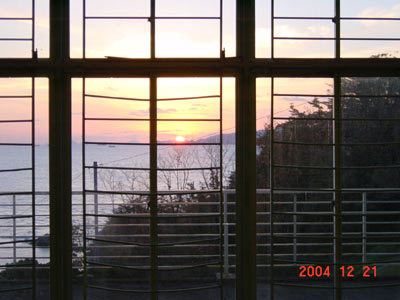午後5時に練習が終了して、台をしまい、後かたづけをする。カーテンをあけると、夕日が沈むところだった。