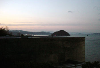 海に浮かんでいるのは鹿島。その向こうは松山の海岸。