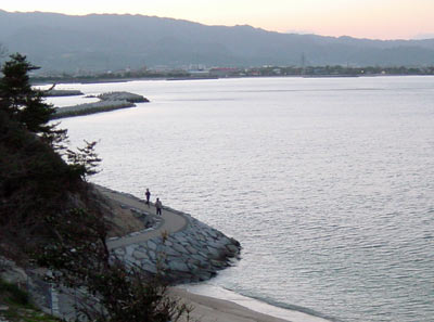 山を下りてから、海岸の堤防(?)の上をセンターまで走ってもどる。向こうに見えるのは堀江の海岸か?