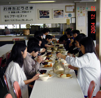 ←初日の夕食風景。練習は学校で行い、その終了後にマイクロバスでセンターに移動し、まず夕食を食べた。