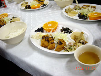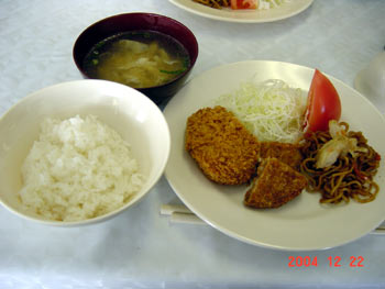 施設に到着して最初の食事である。トンカツであった。この日も午前・午後と学校の体育館で練習していたので、食欲は旺盛であったと思う。 |