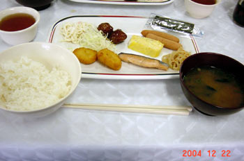以前来たときは、他の団体と一緒で人数が多かったためか、バイキング形式で取り放題だったが、今回は団体は卓球部のみ。人数が少ないためか、すでに個人別に皿にのっていた。朝は食欲不振のものがかなりいた。