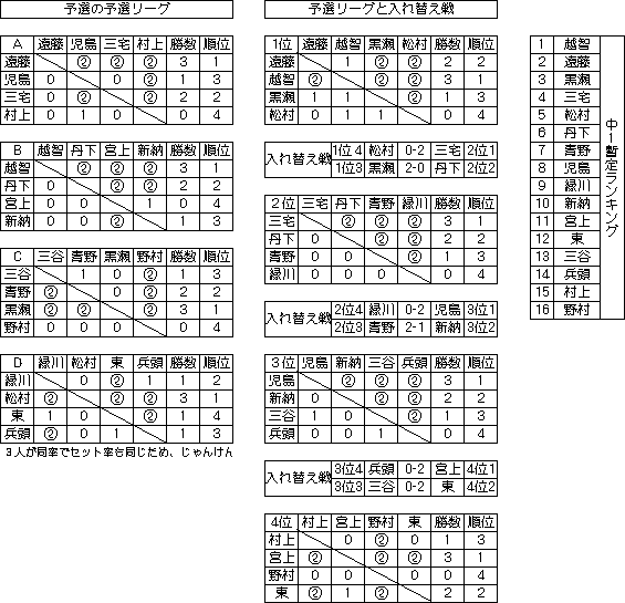 翌日の7月7日のリーグ戦を前に、全くランキングのついていない中1生のために、予選リーグ戦を実施した。最初に予選の予選を実施して、各順位グループでリーグ戦をさらに行った。なお、一部中2生も混じっている。