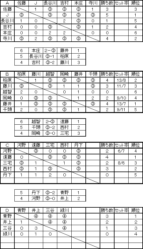 | ↑千頭対西村の入れ替え戦。フルセットの接戦になった。 | ||||||||||||||||||