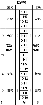 | まず最初に団体戦を実施。北高と愛光高の部員が見守る中、シングルス4人が登場。この写真は2番の寺川:白方戦か(?)。団体のシングルス4人のうち、3本を相手にとられてこちらの勝ちはなくなった。 | ||||||||||