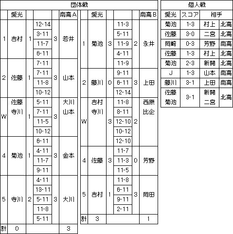 | 「南高A」がレギュラーチーム。南、北、愛光の3校の対抗戦になったので、南だけがABの2チームにわかれ、リーグ戦形式をとった。しかし、愛光と北高との団体戦は行われなかった。