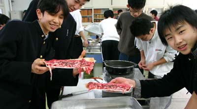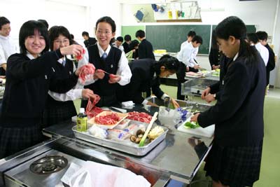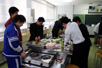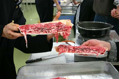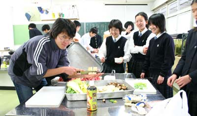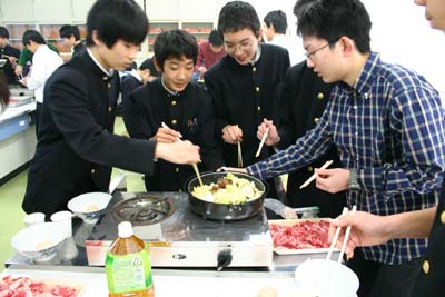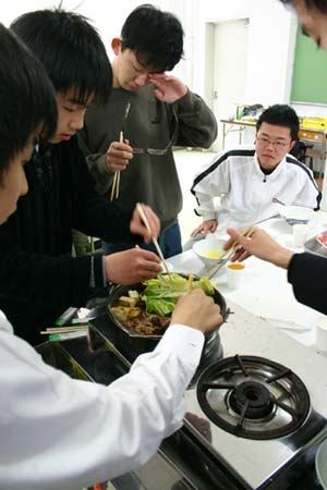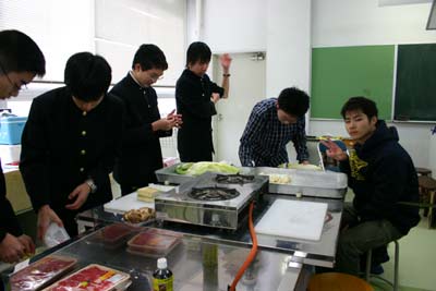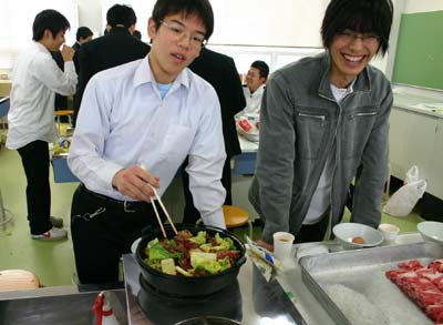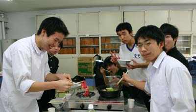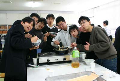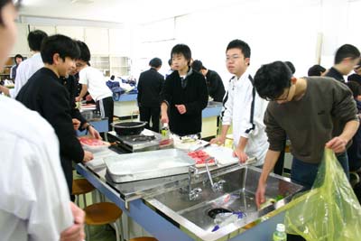 とりあえず、すき焼き大会が開けるように、食材を切り刻むことから開始である。今年はじめて女子部員のテーブルができたが、なかなかユニークな調理をしていた。肉を小さくするのに、包丁は不要である。 |