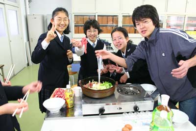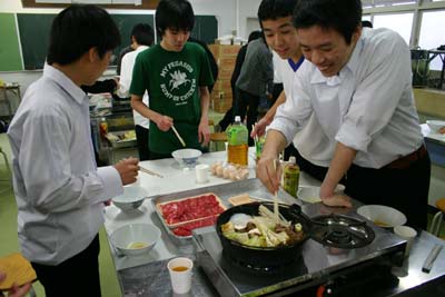 乾杯である。ただし、お茶。茶碗で乾杯する者、若干名。今年は、異種ジュース混合実験を防止する意味もあり、お茶のみ。その後、ひたすら40分ほど各班ですき焼きを食べることになる。 |