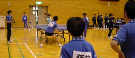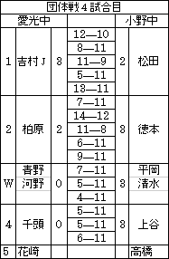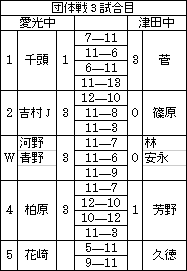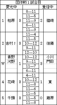 | 3対1でなんとか勝つことができました。最初の試合ということで,双方とも緊張した中で,もつれた試合が多かった。 | 1対3で敗退。もつれた試合を落としたのが残念。これからは技術だけでなく,試合運びのうまさも必要かもしれません。 | 3対1で勝てました。ダブルスをとれたのが大きかったと思います。 | 小野中はこのリーグで一番強いチームです。コンパクトなフォームで鋭い打球をうってくるのが印象的なチームでした。1対3で負けました。でも何とか1ポイントはとれました。 | ||||||||||||||