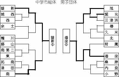 団体戦は4シングルスと1ダブルスの合計6人が出場し、先に3勝した方が勝ちとなる。 大会の結果、左ブロックの優勝は雄新中学、準優勝は南中学。右ブロックの優勝は道後中学、準優勝は旭中学だった。 |
