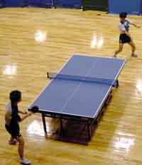 ← 手前の吉村がドライブを打っているところ。相手は村上(南高)。1セット目はとれたが・・・。 |