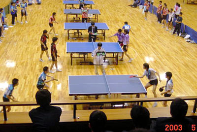 2003年 5月3・4日 高校総体 中予予選個人戦は、初日にダブルス、2日目にシングルスが行われた。どちらもベスト16に入れば、県大会に出場できるが、本校の選手は残念ながら、該当者はいなかった。 |
