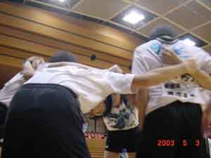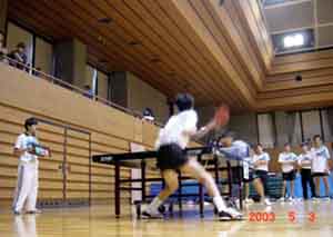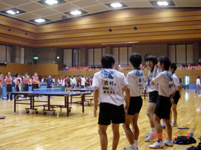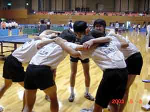 2003年 5月3・4日 高校総体 中予予選47期生もとうとう高2になった。高3では部活ができない本校においては部活最期の年になる。今年の高2は48期の高1生といっしょにチームを編成し、中予予選にのぞんだ。団体戦では、1回戦を突破し、ベスト8に入ることができ、昨年の新人戦に続いて、県大会に出場できることになった。2回戦は接戦であったが、敗退し、夢のベスト4進出はならなかった。 個人戦では、ダブルスもシングルスも残念ながらベスト16に入ることができず、県大会への出場権は獲得できなかった。 |