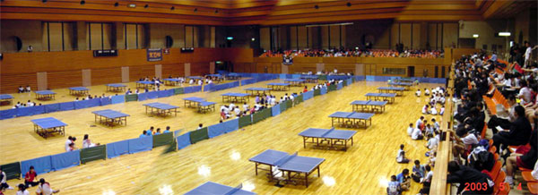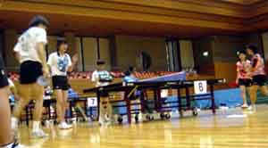 会場は松山市コミュニティーセンターの体育館。初日の団体戦開始前に整列し、これから試合が始まる。今回の愛光チームのメンバーは、[高2]寺川・佐藤・吉村・長谷川・藤川・岡崎、[高1]吉村Jの7名である。メンバーに入れなかった高1生はすぐ上の観客席から応援した。 | ||||||||||||||||||||||||||||||||||||||||||||||||||||||||||||||||
