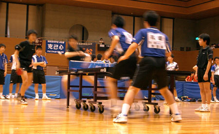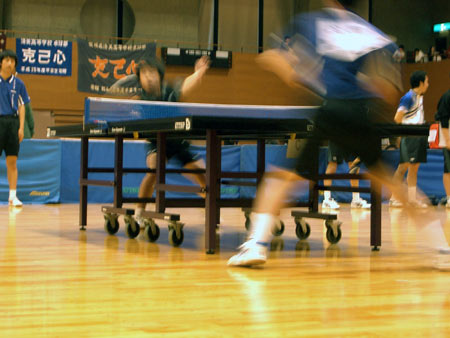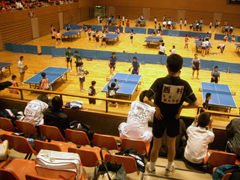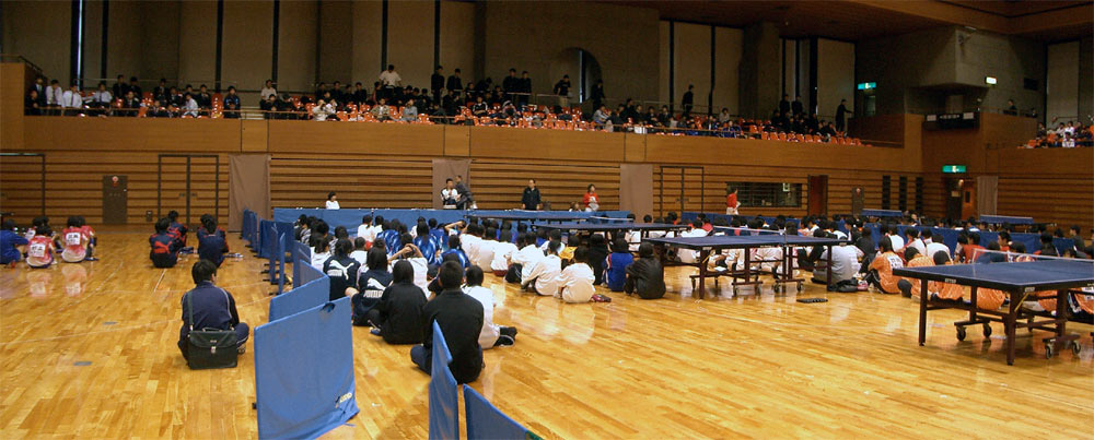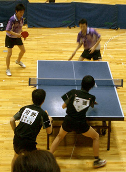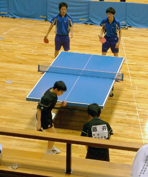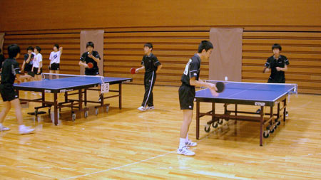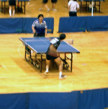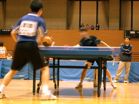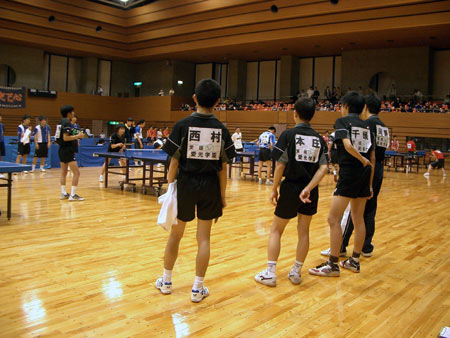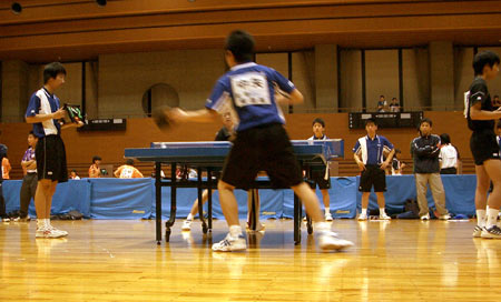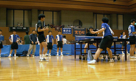 | 団体戦1回戦。1試合目は千頭。となりの台では、2番手の西村が試合を開始した。 |
