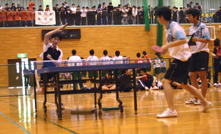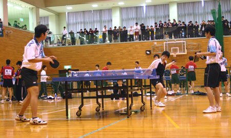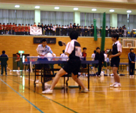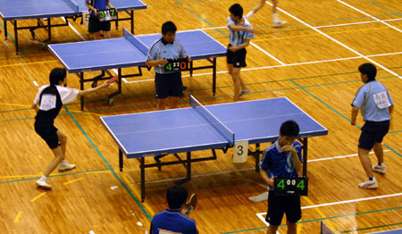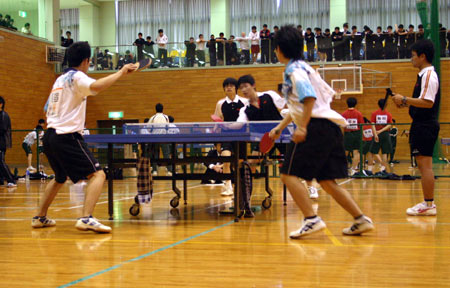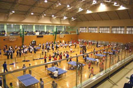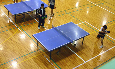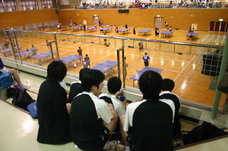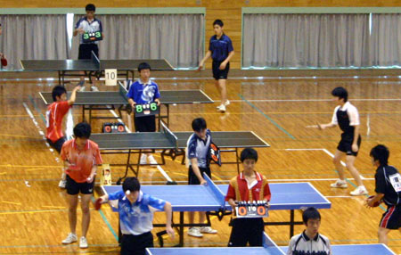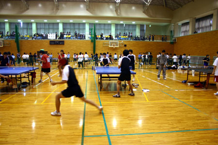 体育館には20台の卓球台が並び、各校ごとにそれぞれ1台ずつの台が割当てられていた。9時から10時まで練習した。